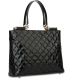 Give your everyday look an avant-garde bite by adding this lustrous quilted black patent leather tote to your stylish ensemble. Glossy and sleek patent leather. Stitched RR RIONI in a quilted design. Punctuated with gold hardware. Rich black RIONI monogram print lining. Top zip closure opens to an interior featuring a zippered center divider pouch. A side pouch and a cell phone pocket allows for easy organization. Interior side zippered pocket.