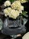 Become elegant and youthful with this beautiful bag. Gentle grey-blue ''RR'' RIONI monogram print on solid black designer canvas body accented with black patent leather trimmings. Dual silver finished chain handles with top leather handles. Side leather buckle trimmings. Back zipper pocket. Top magnetic flap over top with zip closure opens to center zipper divider pocket. Interior black fabric RIONI monogram print lining with phone and side pouch, and side zipper pocket.