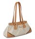 Not just an accessory, but essential to the outfit. The ruffled design with its dual-loop double leather straps. Embossed with gold RIONI Moda Italia emblem. Top zip opening with a gentle espresso brown colored ''RR'' RIONI monogram print on solid ivory colored designer canvas body and light leather trim. Interior golden beige fabric RIONI monogram print lining with cell phone and pocket pouch, zipper pocket, and center divider pocket.