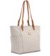 Throw all your goodies into this practical and useful tote. Expresso brown ''RR'' RIONI monogram print on solid ivory colored designer canvas body accented with dual-strapped leather handles and trim. Embossed gold RIONI Moda Italia emblem. Front side pockets. Rear zipper pocket. Has a center zipper entrance opening. Golden beige fabric RIONI monogram print lining. Interior cell phone pouch, pouch pocket, and a zipper pocket.