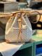 A prestigious bag. Espresso brown ''RR'' RIONI monogram print on solid ivory colored designer canvas body accented with leather handle and trim. Embossed with a gold RIONI Moda Italia logo. Front zipper pouch pocket. Shoulder strap may be adjusted to a more desirable length. Rear zipper pocket. Drawstring entrance opening. Golden beige fabric RIONI monogram print lining. Interior contains a cell phone holder, and a zipper pocket.