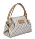 The best gift for all your girlfriends! This small evening bag is light and a sure hit as a bridal gift. The design consists of a gentle expresso brown ''RR'' RIONI monogram print against a solid ivory designer canvas body accented softly with the side ruffle design. The front has the RIONI insignia imprinted in leather. Cute pair of leather handles. Top zip around closure opens to an all fabric golden beige RIONI monogram lining.