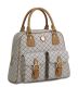 A little bag with a big punch. Espresso brown ''RR'' RIONI monogram print on solid ivory colored designer canvas body accented with dual-looped leather handles and trim. Embossed gold RIONI Moda Italia emblem. Two front decorative flap pockets with magnetic clasps. Rear zipper pocket. Zipper opening entrance. Golden beige fabric RIONI monogram print lining. Interior pouch pocket and zipper pocket. Detachable shoulder strap included..