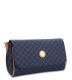 Eeny, meeny, miny, moe, grab this handbag and let's go! Gentle dark gold "RR" RIONI monogram print on navy blue designer canvas body accented with leather trim and gold hardware. Embossed RIONI Moda Italia emblem. Chain link strap and a back zippered pocket. Fold-over flap features a magnetic closure. Navy blue fabric RIONI monogram print lining. Interior contains a side pocket pouch and a side zippered pocket. Comes with a detachable shoulder strap.