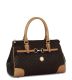 Feel like a princess. Gentle gold "RR" RIONI monogram print on solid dark brown designer canvas body accented with leather trimmings that darkens over time. Double rounded leather handles. Front and back zipper pocket. Top leather trimmings. Embossed gold RIONI Moda Italia emblem. Detachable shoulder strap included. Top gold metal zipper closure opens to center zipper divider pocket. Interior coffee brown fabric RIONI monogram print lining with phone and side pouch, and side zipper pocket.