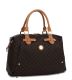 Show off your exquisite taste in the crook of your arm with the Cameron satchel. Gentle dark gold "RR" RIONI monogram print on solid brown designer canvas body. Leather trim accents and gold hardware. Two front concealed zippered pockets. Rear zippered pocket. Top zip closure opens to a coffee brown fabric RIONI monogram print lining. Interior features a side pocket, a cell phone pouch, and a zippered pocket on the side. A detachable shoulder strap is included.