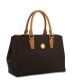 Be uniquely cheeky-chic with this adorable piece. Gentle dark gold "RR" RIONI monogram print on solid brown designer canvas body accented with leather trim and gold hardware. Dual handles. Two side zippered compartments and one center compartment with a top hook closure. Dark brown fabric RIONI monogram print lining. Interior features a cell phone pouch, a pocket pouch, and a side zippered pocket. Comes with a detachable shoulder strap.