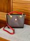 Want to turn heads in a crowd without making a scene? Stand out with this red and brown hand-punched polka dots chain satchel. Bold red trim handle straps paired with golden chain hardware against the gentle gold "RR" RIONI monogram print on solid dark brown designer canvas body. Adjustable and detachable red trim cross body strap for options. Gentle gold "RR" RIONI monogram print on solid dark brown designer canvas body accented with red leather trimmings. Gold feet on base along with rear gold zipper pocket. Gold metal zipper entrance opens to interior coffee brown fabric RIONI monogram print lining with phone and side pouch, and side zipper pocket.