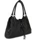 Grab attention with this one. You can fit anything you can think of in this one! Double handled shoulder bag with button closure for handles and hanging tassels with the RIONI ''R''. All genuine onyx black colored pebbled leather with belt like trimmings. Magnetic closure opens to three compartments with center zip around divider pocket. Interior black fabric RIONI monogram print lining, cell phone and pocket pouch, and zipper pocket.