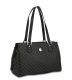 Practical with a hint of style. Gentle grey "RR" RIONI monogram print on solid black designer canvas body accented with leather trimmings. Double flat leather handles. Side leather trimmings. Back zipper pocket. Embossed silver RIONI Moda Italia emblem. Top zipper closure opens to center zipper divider pocket. Interior black fabric RIONI monogram print lining with phone and side pouch, and side zipper pocket.