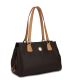 Practical with a hint of style. Gentle gold "RR" RIONI monogram print on solid dark brown designer canvas body accented with leather trimmings. Double flat leather handles. Side leather trimmings. Back gold metal zipper pocket. Embossed gold RIONI Moda Italia emblem. Top gold metal zipper closure opens to center zipper divider pocket. Interior coffee brown fabric RIONI monogram print lining with phone and side pouch, and side zipper pocket.