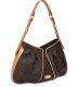 The polised Iris bag is sure to grab the attention of all the fashionistas out there in the world. Front and back is accentuated by a gathered design. Gentle dark gold RR RIONI monogram print on solid brown designer canvas body with leather trim and gold hardware. Coffee brown fabric RIONI monogram print lining. Features a top zip closure to keep your belongings safe. Interior contains a cell phone pouch, a side pocket, and a side zippered pocket.