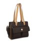 Gentle brown ''RR'' RIONI monogram print on solid brown designer canvas body accented with dual-strapped handle and leather trim. Embossed gold RIONI Moda Italia emblem. Single front flap pocket lined in suede reveals two pouch pockets. Side flap pouch pocket lined in suede. Zipper opening entrance. Rear zipper pocket. Coffee brown fabric RIONI monogram print lining. Interior contains a cell phone pouch, pocket pouch and a zipper pocket.