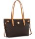 Carry a little or carry a lot, doesn't matter with this bag. Gentle gold "RR" RIONI monogram print on solid dark brown designer canvas body accented with leather trimmings that darkens over time. Double flat handles. Side leather trimmings. Embossed gold RIONI Moda Italia emblem. Back zipper pocket. Double magnetic closure opens to interior coffee brown fabric RIONI monogram print lining with phone and side pouch, and side zipper pocket.