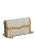 Go simple yet classy with this purse. Espresso brown "RR" RIONI monogram print on solid ivory colored designer canvas body accentuated with leather trimming. Rear zipper pocket. The embossed gold RIONI Moda Italia emblem button opens to a leather and goldenrod fabric interior. Features six respective credit card slots, vertical sleeve for cash, center divider and a zipper pocket. Detachable gold chain with leather handle to transform an everyday purse into a clutch for a night out with the girls.