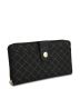 Small enough to be a wallet, big enough to be a clutch to go with whichever mood you're in. Gentle grey ''RR'' RIONI monogram print on solid black designer canvas body. Embossed with silver RIONI Moda Italia emblem. Rioni monogram lining. Outside contains two side pockets, one with button closure. Zip around closure opens to black suede with six dividing compartments, center coin holder, and twelve credit card holders. Also comes with a detachable identification card holder.