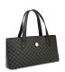 Gentle grey ''RR'' RIONI monogram print on solid black designer canvas body accented with dual-strapped leather handles and trim. Embossed gold RIONI Moda Italia logo. Opens to three compartments separated by a large zip pocket in the center. Rear zipper pocket. Black fabric RIONI monogram print lining. Interior contains two pocket pouches, a cell phone holder, and two zipper pocket. Detachable shoulder strap is also included.