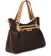 The perfect daytime bag for all of your needs. Front and back is accentuated by a gathered design. Gentle dark gold RR RIONI monogram print on solid brown designer canvas body accented with leather trim and gold hardware. Front and rear gold metal zipper pockets. Dark brown fabric RIONI monogram print lining. Gold metal zipper top opens to a spacious interior with a center zippered pouch divider. Features a cell phone pouch, a pocket, and a side zippered pocket. Comes with a detachable shoulder strap.
