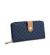 Small enough to be a wallet, big enough to be a clutch to go with whichever mood you're in. Gentle dark gold ''RR'' RIONI monogram print on navy blue designer canvas body. Embossed with gold RIONI Moda Italia emblem. Rioni monogram lining. Outside contains two side pockets, one with button closure. Zip around closure opens to brown suede with six dividing compartments, center coin holder, and twelve credit card holders. Also comes with a detachable identification card holder.