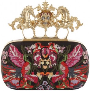 While browsing the internet I came across this exaggerated knuckle clutch by Alexander Mcqueen, which I think is embellished to an entirely extraordinary level. You have silk satin, leather, floral prints, crystals, skulls, unicorns, brass knuckles…Need I say more? Both unicorns on top of the clutch gave off the impression of having galloped into a plethora of unknown objects. If or when you are strolling around in a shady neighborhood and you run into trouble, consider using this piece of art as a highly defensive mechanism. For those who are and in dying need of this clutch you can purchase it from the Alexander Mcqueen website for a price of $2,455, which I think is fair because it almost serves as a multi-tool.