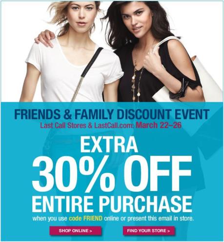 Isn't it great when friends and families are celebrated? I'll definitely agree to that when it comes to sales! From now until March 26, 2012 take an additional 30% off your entire purchase at Last Call Stores and at LastCall.com. Limit one coupon per customer. To receive savings online, enter the code