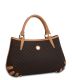 Designed to be the embodiment of your refined elegance, this satchel will become one of your essential accessories. Gentle dark gold "RR" RIONI monogram print on solid brown designer canvas body with leather trim and gold hardware. Rear zippered pocket. Coffee brown fabric RIONI monogram print lining. Top zip closure opens to zippered center divider pouch. Interior features a side pocket, a cell phone pouch, and a zippered pocket on the side.