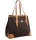 Be the inspiration behind fashion-forward versatility. Gentle dark gold "RR" RIONI monogram print on solid brown designer canvas body accented with leather trim and gold hardware. Dual adjustable shoulder straps. Cinched sides with a button snap. Rear zippered pocket. Top hook closure opens to an interior cell phone pouch, a pocket pouch, and a side zippered pocket. Dark brown fabric RIONI monogram print lining. Center zippered pocket doubles as a divider.