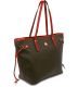 Carry a little or carry a lot, doesn't matter with this bag. Gentle gold "RR" RIONI monogram print on solid dark brown designer canvas body accented with red leather trimmings. Double flat handles. Side leather trimmings. Embossed gold RIONI Moda Italia emblem. Gold feet on base along with rear gold zipper pocket. Gold metal zipper entrance opens to interior coffee brown fabric RIONI monogram print lining with phone and side pouch, and side zipper pocket.