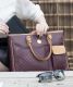 Class is in session. Gentle light grey ''RR'' RIONI monogram print on solid burgundy designer canvas body accented with dual-looped leather handles and trim. Rear zipper pocket. Front zipper pouch pocket and flap pouch. Gold metal zipper opening entrance. Gold metal zipper expansion. Coffee brown fabric RIONI monogram print lining. Interior cell phone pouch, pocket pouch, two zipper pockets, leather pen holder, and leather card slots. Detachable shoulder strap included.