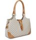 One-of-a-kind. Expresso brown ''RR'' RIONI monogram print on solid ivory colored designer canvas body accented with tan dual-looped leather handles and trim. Unique leather and buckle flap with magnetic clasp. Rear zipper pocket. Opens to three compartments with a center zipper opening entrance. Golden beige fabric RIONI monogram print lining. Interior leather card holders, leather pen holder, cell phone pouch, pouch pocket and three zipper pocket.