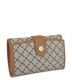 Compact and light, but holds a lot. In a expresso brown ''RR'' RIONI monogram print against solid ivory colored designer canvas body. Embossed with gold RIONI Moda Italia emblem with an adjustable button flap closure which opens to a button coin purse. The button coin purse then opens up to reveal the credit card sleeves. Smooth leather interior with sixteen slots to hold credit cards, a top sleeve for cash, and five vertical sleeves for miscellaneous items.