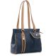 Stylish and practical at the same time. Consists of a gentle dark gold ''RR'' RIONI monogram print on solid navy blue designer canvas body accented with leather handles and trim. Embossed with a gold RIONI Moda Italia logo. Front vertical zipper pocket. Front accessory pouch pocket. Rear zipper pocket. Navy blue fabric RIONI monogram print lining. Opens to three compartments. Interior contains two zipper pockets and a cell phone holder.